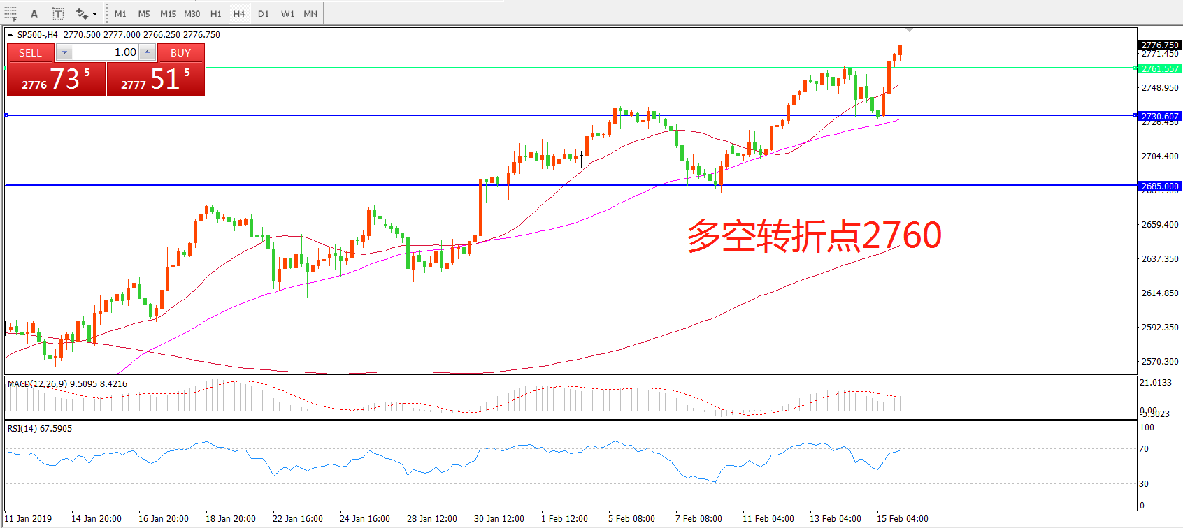 4小时图看,SP500触及55均线支撑后快速反弹,上升趋势明显,均线系统呈多头排列,MACD红柱增加,延续涨势是大概率事件。