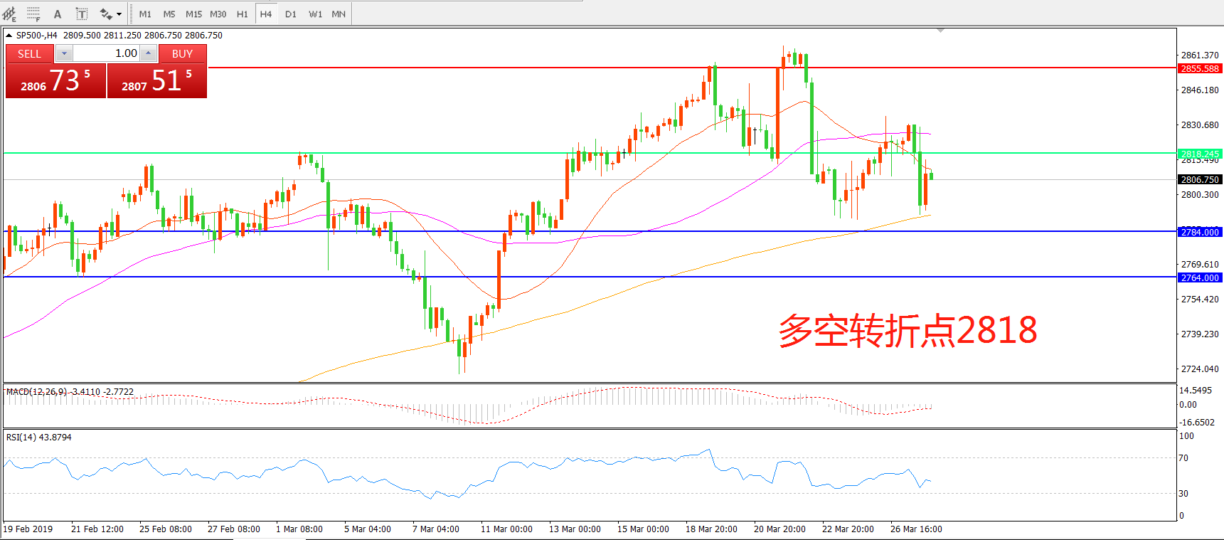 4小时图看,标普500高位回落后呈现宽幅震荡态势,200周期均线成为短期支撑,MACD红柱增加,RSI拐头向上,日内依然以弱势整理为主。