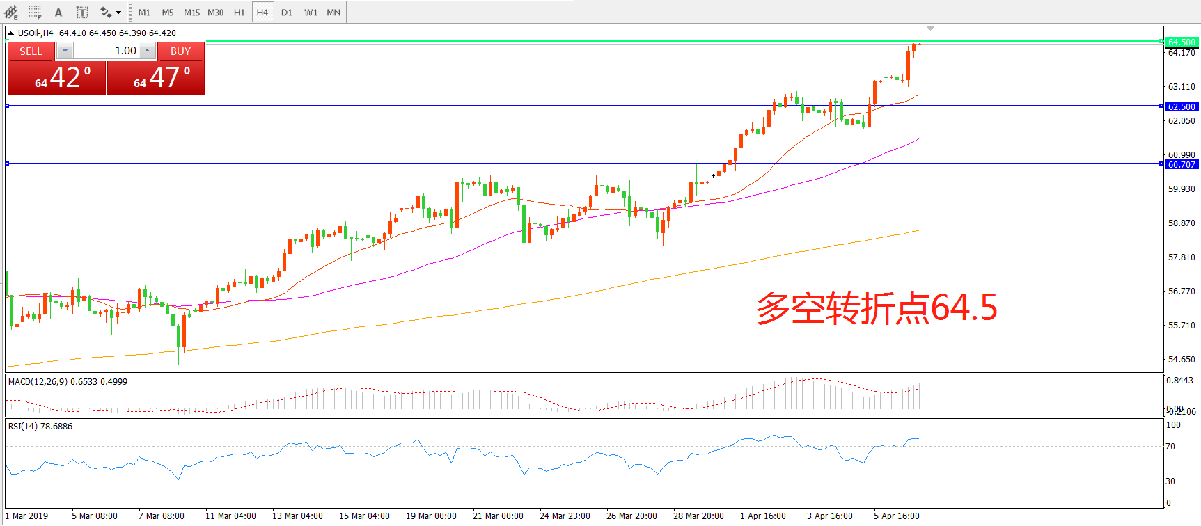 周一(4月8日),美国总统特朗普宣布将伊朗伊斯兰革命卫队列为恐怖组织,加剧了中东的紧张局势, 另一方面利比亚局势再度紧张,大约100万桶/日的产量中有40%恐受到影响,这令OPEC原油供应面临进一步下滑的风险。油价周一盘中延续涨势。美国WTI原油盘中最高触及64.48美元/桶,为去年10月31日以来最高,最终收报64.42美元/桶。