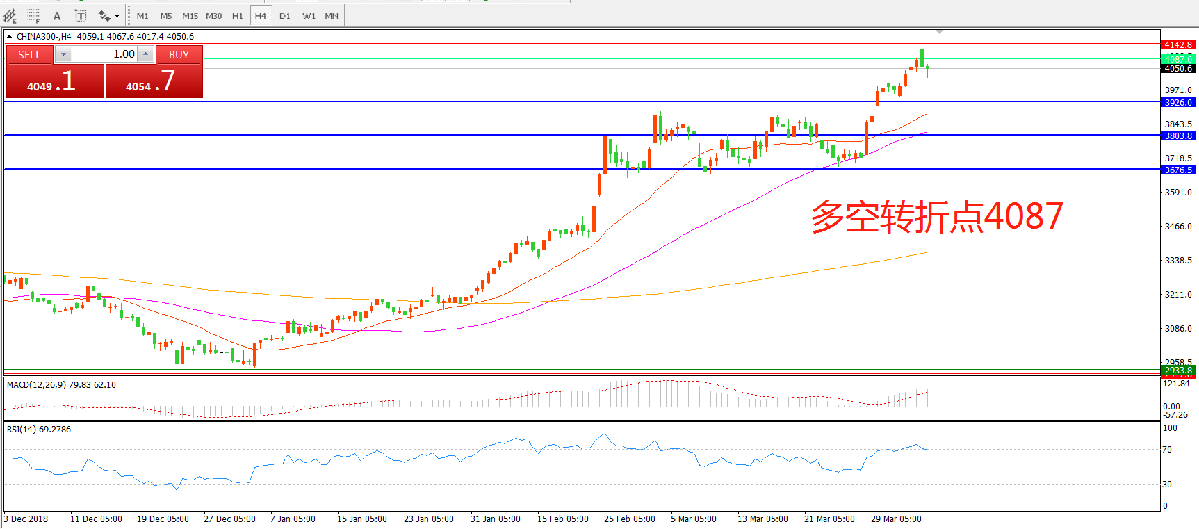 4小时图看,中华指数阳线连续拉升,昨日一度接近4142后出现回落,但整体依然偏多。 MACD红柱增加,RSI指标拐头,多头趋势依然明显,延续上升概率较大。