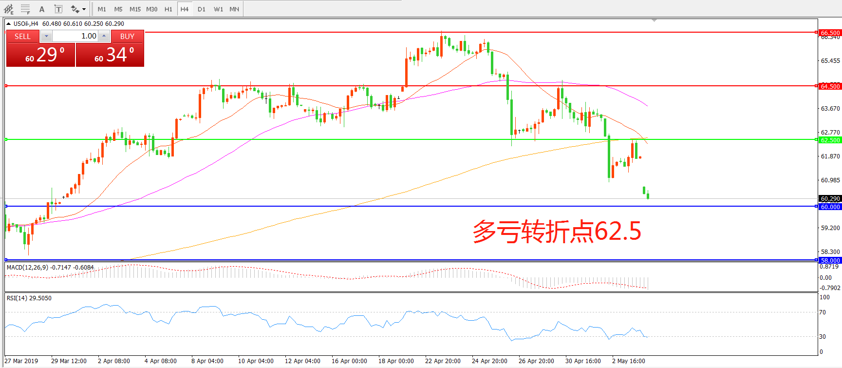 交易策略: 在62.50之下看跌,目标60.00 58.00
