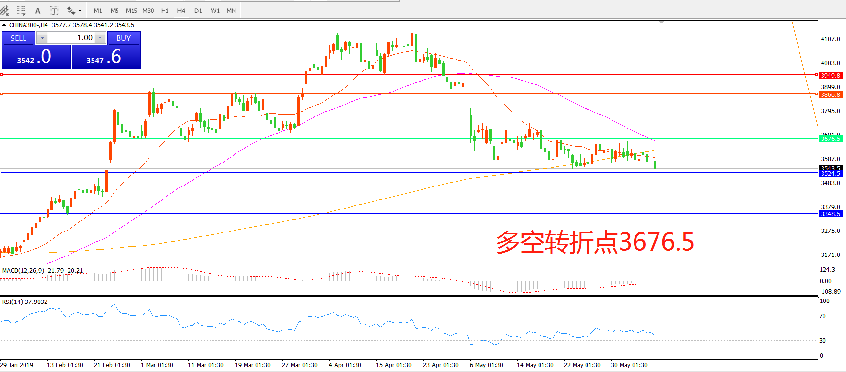 4小时图看,沪深300指数在跌破3676.5后陷入弱势震荡, 短期走势依然偏空MACD绿柱缩短,RSI指标拐头向下,近期以震荡下行思路对待。