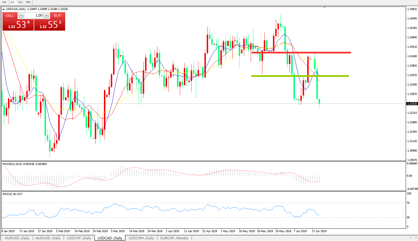 技术面简析:日线图均线开始再度下行价格快速跌穿多空转折区域及前低点MACD在0轴下方运行且动能柱再度放量RSI反弹后逐步走低,预计汇价将进一步下行