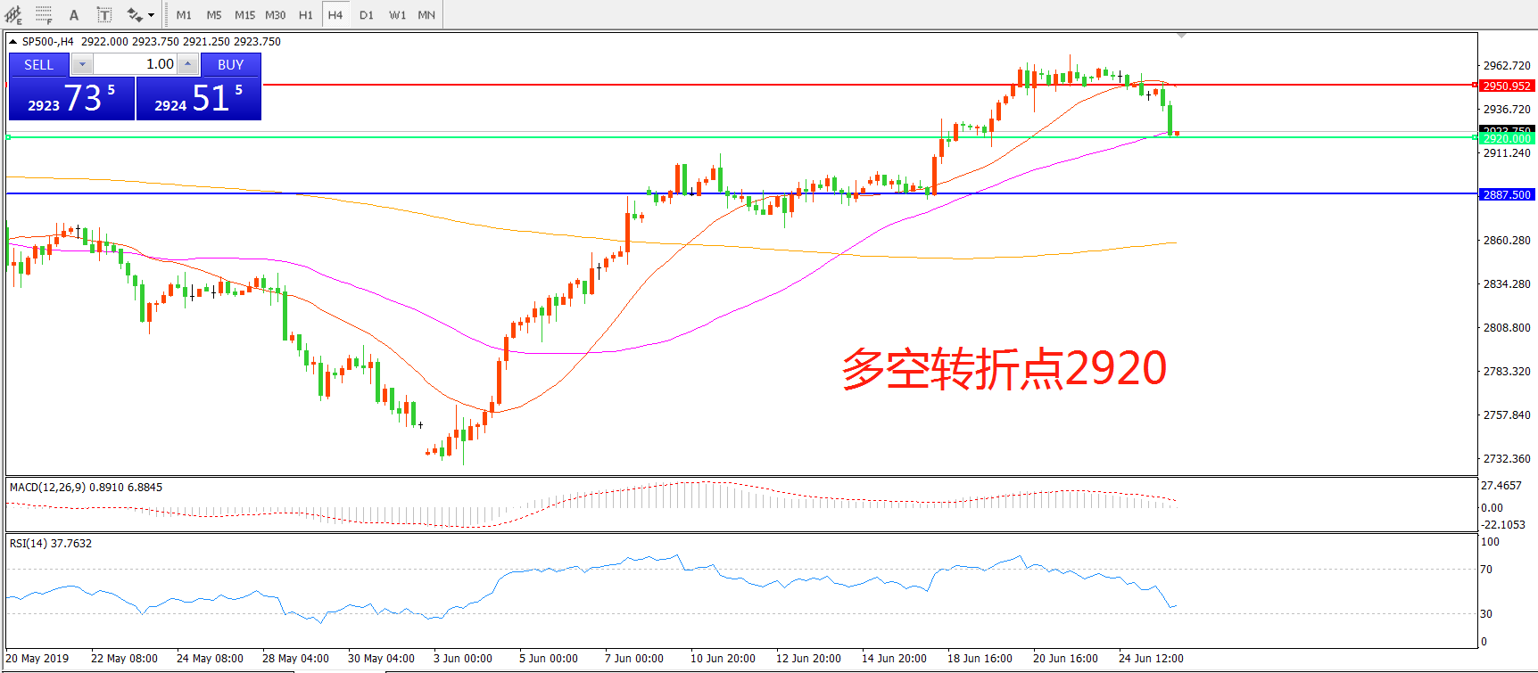 4小时图看,标普震荡上行后高位跳水,显示上方2950附近阻力依然较强,均线系统呈多头排列,MACD红柱减少,RSI指标向上,区间震荡概率较大。