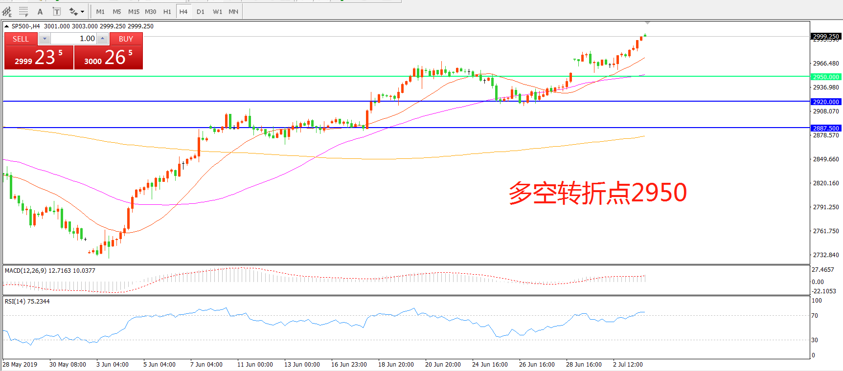 4小时图看,标普站稳2950后震荡上行,反弹动能较强,均线系统粘合成为下方支撑,MACD红柱增加,RSI指标拐头向上,日内延续上行概率较大。