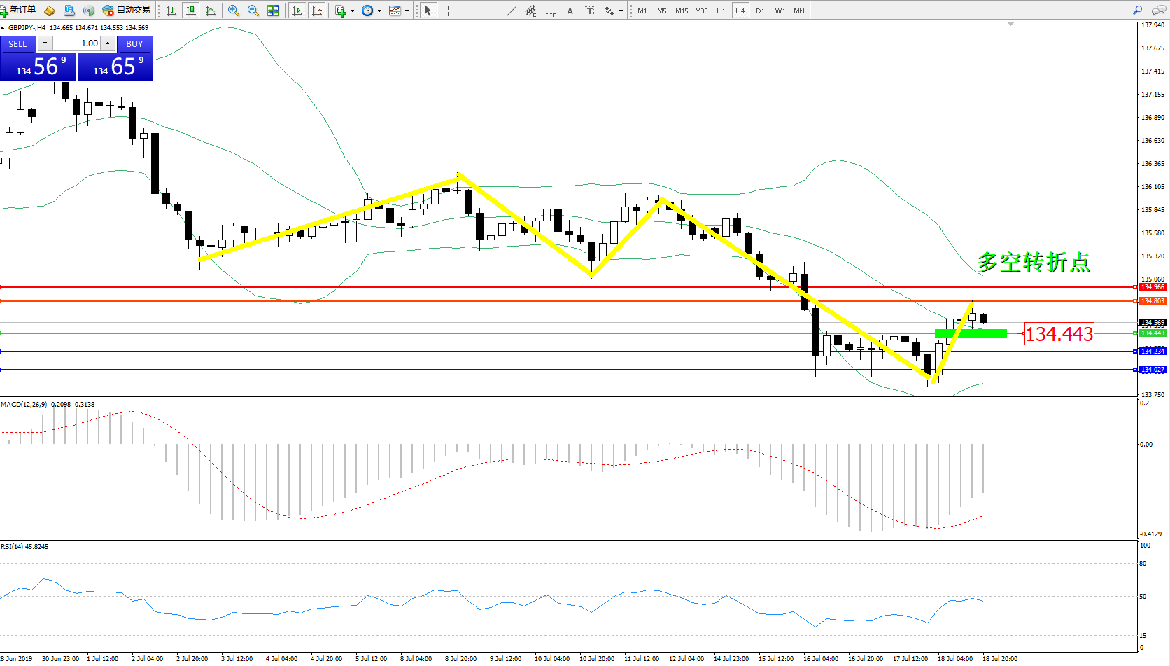 交易策略:134.443上方看涨,目标134.803、134.966
