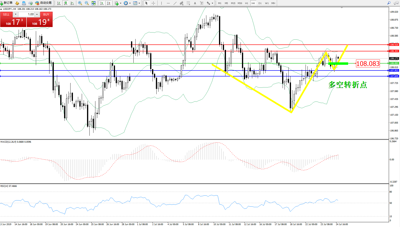 美日V型反转上行,尽管美元表现强势,但日内对全球经济衰退的担忧,加上法德及欧元区PMI数据不及预期,令避险日元受宠。英国新首相带来的无序脱欧预期也提振了避险资产,随着内阁成员逐渐确定,市场将转向英国能否在10月31日之前顺利脱欧。