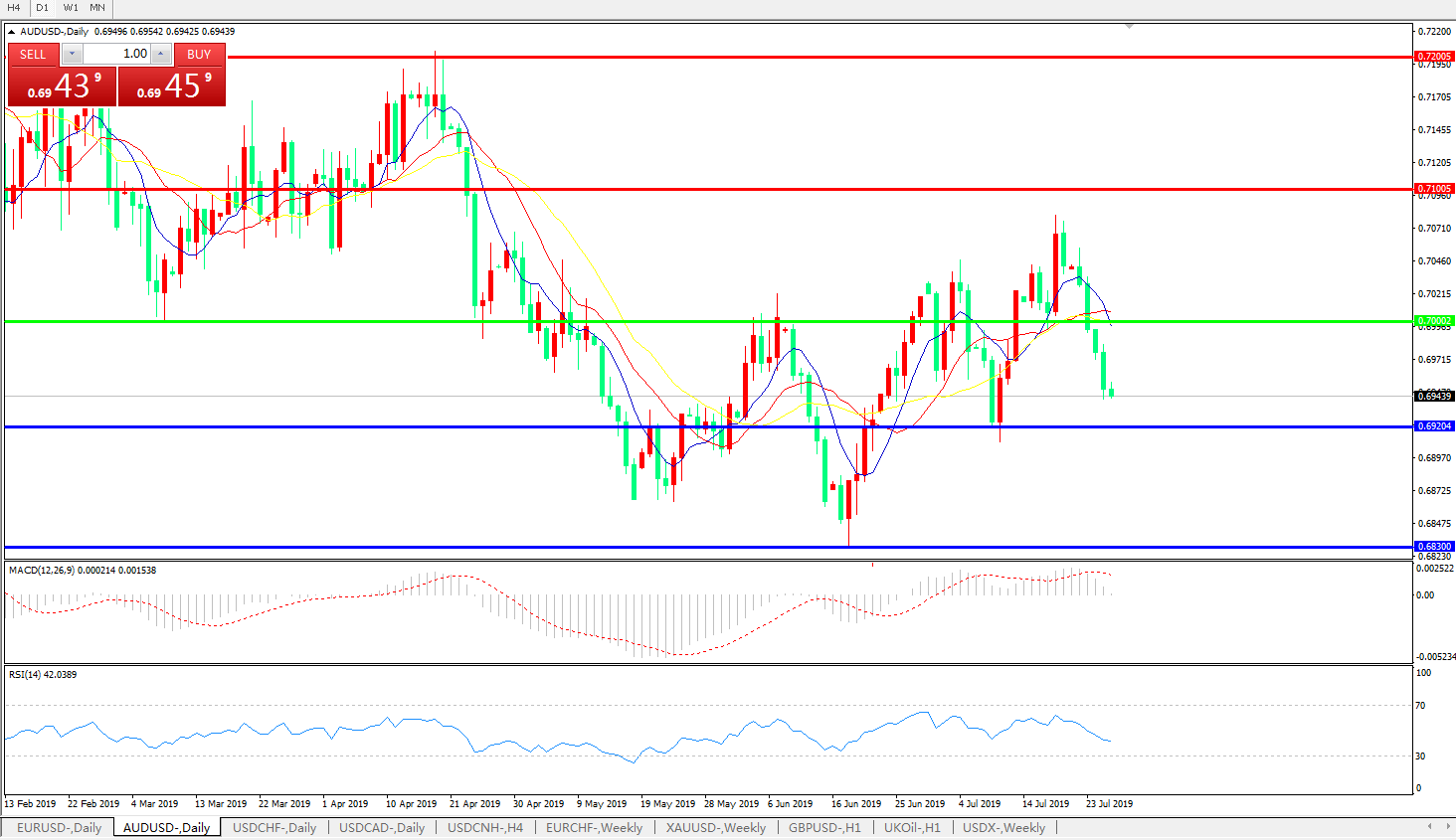 澳元兑美元在周四日内延续疲软走势,自上周五以来已经连续第五个交易日走低。近期美元指数的坚挺表现显然对非美货币起到了打压效果,而澳洲联储官员日内的表态则更是起到了推波助澜的效果;澳洲联储主席洛威稍早表示,在澳洲联储此前在6月和7月“背靠背”降息之后,未来仍有进一步加大宽松力度的需求和空间,此状况令投资者反而对澳洲经济前景以及其在全球贸易风波中的处境感到益发担心,因而,澳元继续回吐前期涨幅,回撤到0.6960一线的两周低位; 技术上来看,澳元兑美元暂时在60日均线切入位0.6961尚有支撑,若失守,将进一步下看7月初的前期波段低点0.6911 ,该点位的失守将意味着下行趋势被重新巩固。而反过来,如果汇价能在短期内收复0.70关口,则前景将被重新看好