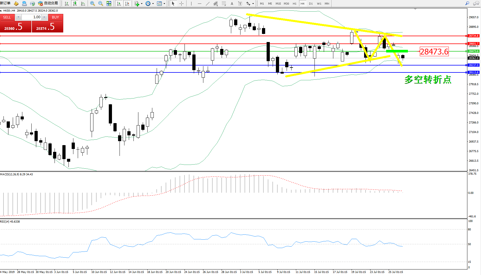 香港恒生指数7月26日(周五)收盘下跌196.56点,跌幅0.69%,报28397.74点;恒指低开低走,最低抵达28269附近,短暂企稳回升,政府统计处公布6月份进出口数据,出口货值3,096亿元,按年急挫近9%,远差过预期跌2.3%,连续下跌8个月。而进口货值3,648亿元,按年下跌7.5%。期内贸易逆差552亿元。由于有部份厂商提高海外生产能力,导致出口货值大幅向下。但外围经济持续弱势,也是原因之一,估计下半年仍难好转。