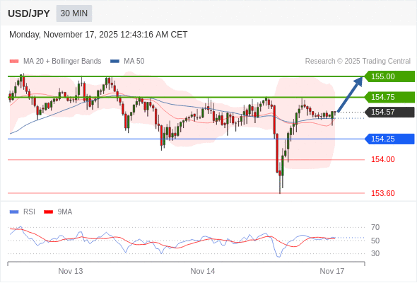 在 154.25 之上,看涨,目标价位为 154.75 ,然后为 155.00 。
