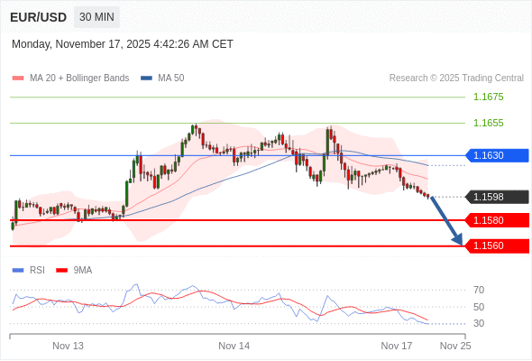 在 1.1630 之下,看跌,目标价位为 1.1580 ,然后为 1.1560 。
