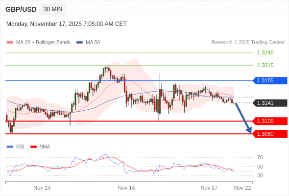 交易策略: 在 1.3185 之下,看跌,目标价位为 1.3105 ,然后为 1.3080 。