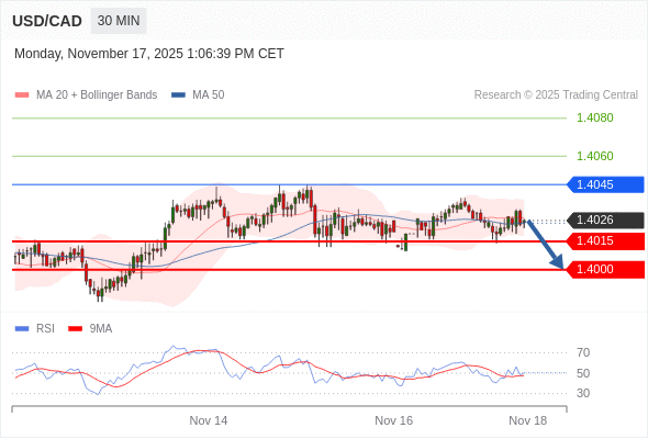 在 1.4045 之下,看跌,目标价位为 1.4015 ,然后为 1.4000 。