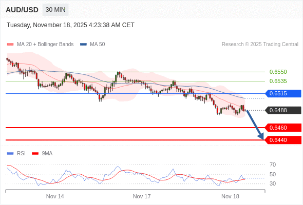 在 0.6515 之下,看跌,目标价位为 0.6460 ,然后为 0.6440 。