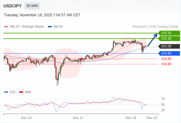 在 154.80 之上,看涨,目标价位为 155.35 ,然后为 155.55 。