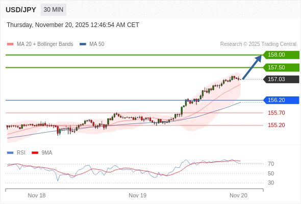 在 156.20 之上,看涨,目标价位为 157.50 ,然后为 158.00 。