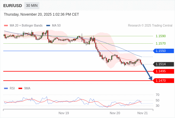 在 1.1550 之下,看跌,目标价位为 1.1495 ,然后为 1.1470 。