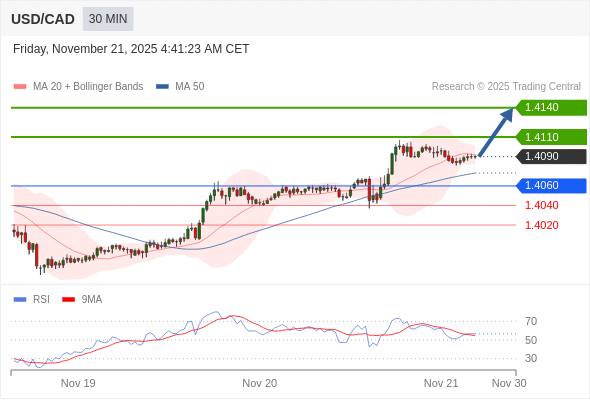 在 1.4060 之上,看涨,目标价位为 1.4110 ,然后为 1.4140 。