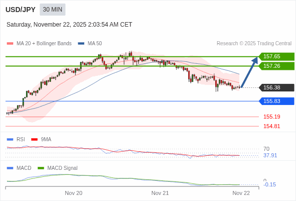 美元/日元 当日内 : 有上涨的可能,目标价位定在 157.65 。