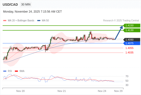 在 1.4075 之上,看涨,目标价位为 1.4130 ,然后为 1.4150 。