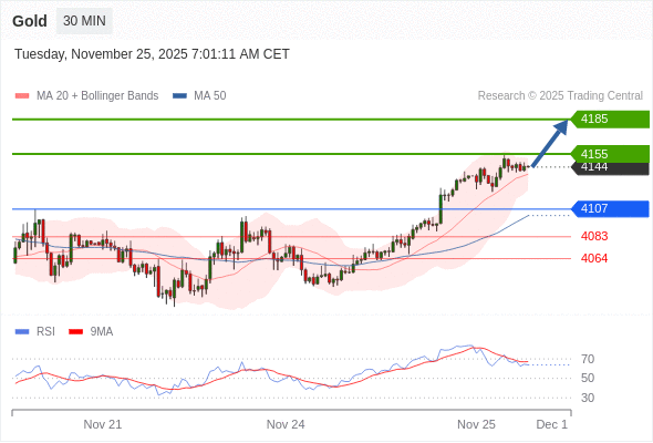 在 4107 之上,看涨,目标价位为 4155 ,然后为 4185 。