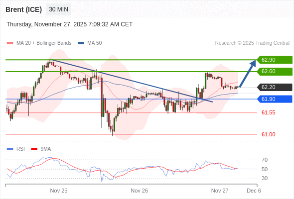 在 61.90 之上,看涨,目标价位为 62.60 ,然后为 62.90 。