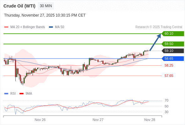 在 58.65 之上,看涨,目标价位为 59.50 ,然后为 60.10 。