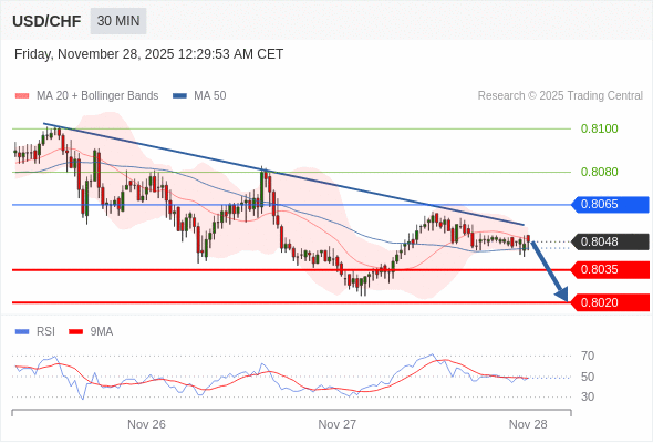 在 0.8065 之下,看跌,目标价位为 0.8035 ,然后为 0.8020 。