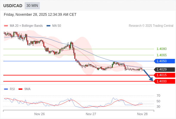 交易策略: 在 1.4050 之下,看跌,目标价位为 1.4015 ,然后为 1.4000 。
