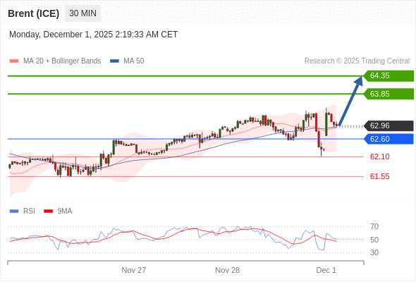 在 62.60 之上,看涨,目标价位为 63.85 ,然后为 64.35 。