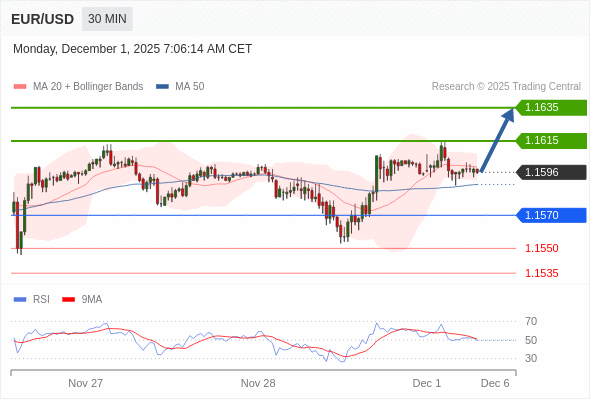 在 1.1570 之上,看涨,目标价位为 1.1615 ,然后为 1.1635 。