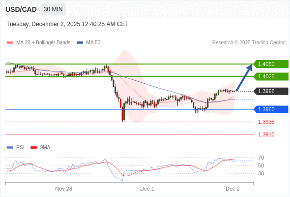 在 1.3960 之上,看涨,目标价位为 1.4025 ,然后为 1.4050 。