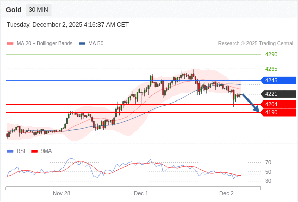 在 4245 之下,看跌,目标价位为 4204 ,然后为 4190 。