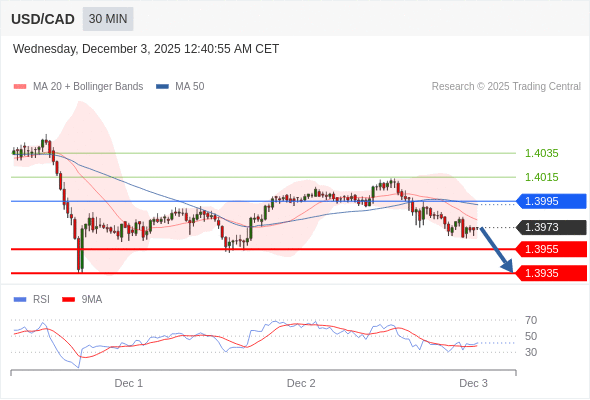 在 1.3995 之下,看跌,目标价位为 1.3955 ,然后为 1.3935 。