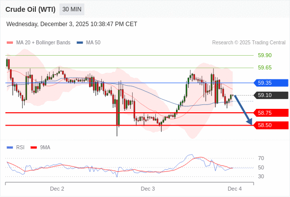 在 59.35 之下,看跌,目标价位为 58.75 ,然后为 58.50 。