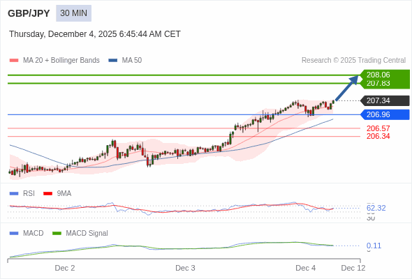 英镑/日元 当日内 : 看涨,当 206.96 为支撑位,目标定在208.06。