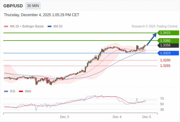 在 1.3323 之上,看涨,目标价位为 1.3380 ,然后为 1.3415 。