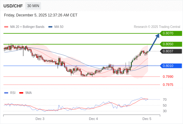 在 0.8010 之上,看涨,目标价位为 0.8050 ,然后为 0.8070 。