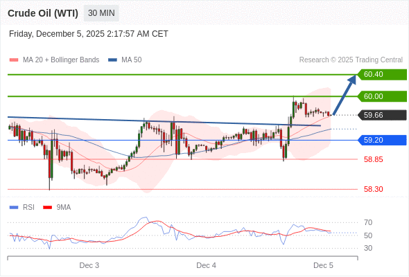 在 59.20 之上,看涨,目标价位为 60.00 ,然后为 60.40 。