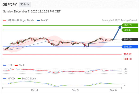 英镑/日元 当日内: 看涨,当 206.29 为支撑位,目标定在208.69。
