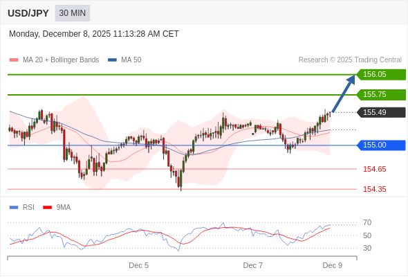 在 155.00 之上,看涨,目标价位为 155.75 ,然后为 156.05 。