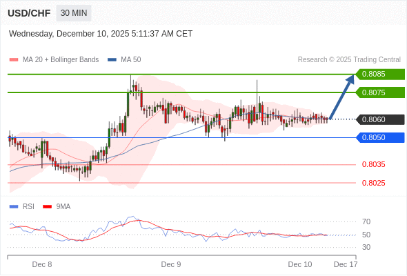 在 0.8050 之上,看涨,目标价位为 0.8075 ,然后为 0.8085 。