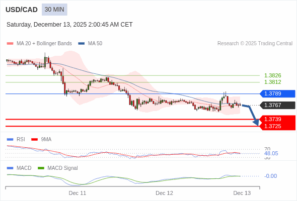 美元/加元 当日内 : 看跌,在 1.3789 之下。