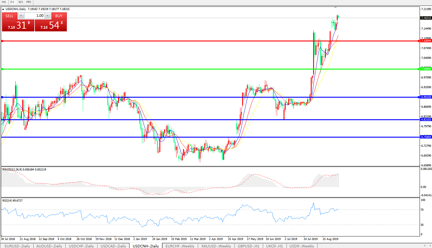 技术面简析:日图均线呈有序多头排列,汇价有再度走高呈强势上攻状态,MACD运行在0轴上方且动能有再度放量迹象,RSI超买区域附近徘徊,预计短期汇价将维持攻势,重点关注7.20-7.30区间的压制;中美贸易战后续进展决定汇价中期走势。