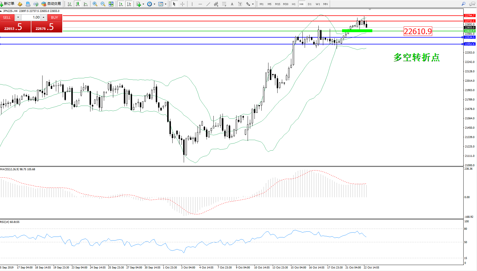 日经225指数10月21日(周一)收盘上涨57.82点,涨幅0.26%,报22550.50点。日本央行总裁黑田东彦表示,日本央行若需要放宽政策,就“一定”会调降中短期利率,表明进一步调低负利率将是其对抗海外风险升高的主要工具。“如果我们需要进一步放宽货币政策,我们就一定会调低中短期利率。但我们不想降低超长期利率,”他在周六参加国际货币基金组织(IMF)和世界银行会议后表示。这也是迄今为止黑田东彦所发出最强烈的信号,表明日本央行如果要放松政策,最可能采取的措施将是推动短期利率目标在负值区间内进一步下降。