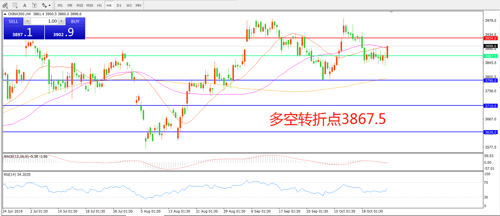 4小时图看,沪深300震荡后强势拉升,整体走势有所回暖,3924成为上方阻力,均线系统走平,MACD红柱缩短,RSI指标向上,重点关注3924一线得失。