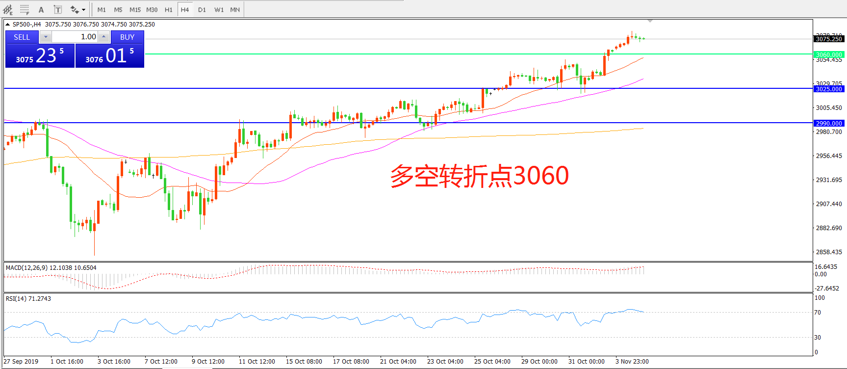 4小时图看,标普500阳线连续拉升,整体走势偏强,退守3025支撑,均线系统走平,MACD红柱减少,RSI指标走平,日内小幅调整概率较大。