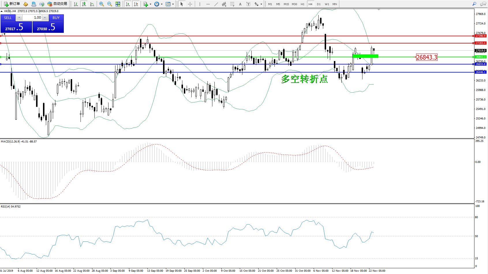 香港恒生指数今日震荡收涨1.5%,收报26993.04点,盘中一度站上27000点整数关口。港股大幅高开278点,随后有买盘支持再续造好,最高触及27114位置,昨天本港举行地区议会选举,过程顺利及完满结束,选民投票率亦创出新高。目前港股市场的估值水平处在历史较低水平,具备良好的投资价值,如有国内经济能企稳回升,恒生指数有望继续震荡上行。联储连续降息导致美元流动性走宽,带动风险资产上涨及短期亢奋情绪,价值股包括在香港上市的内地银行、香港银行及香港房地产最为受益,但中长期还是基本面及盈利能力主导,降息相关的利好效应不会持续。