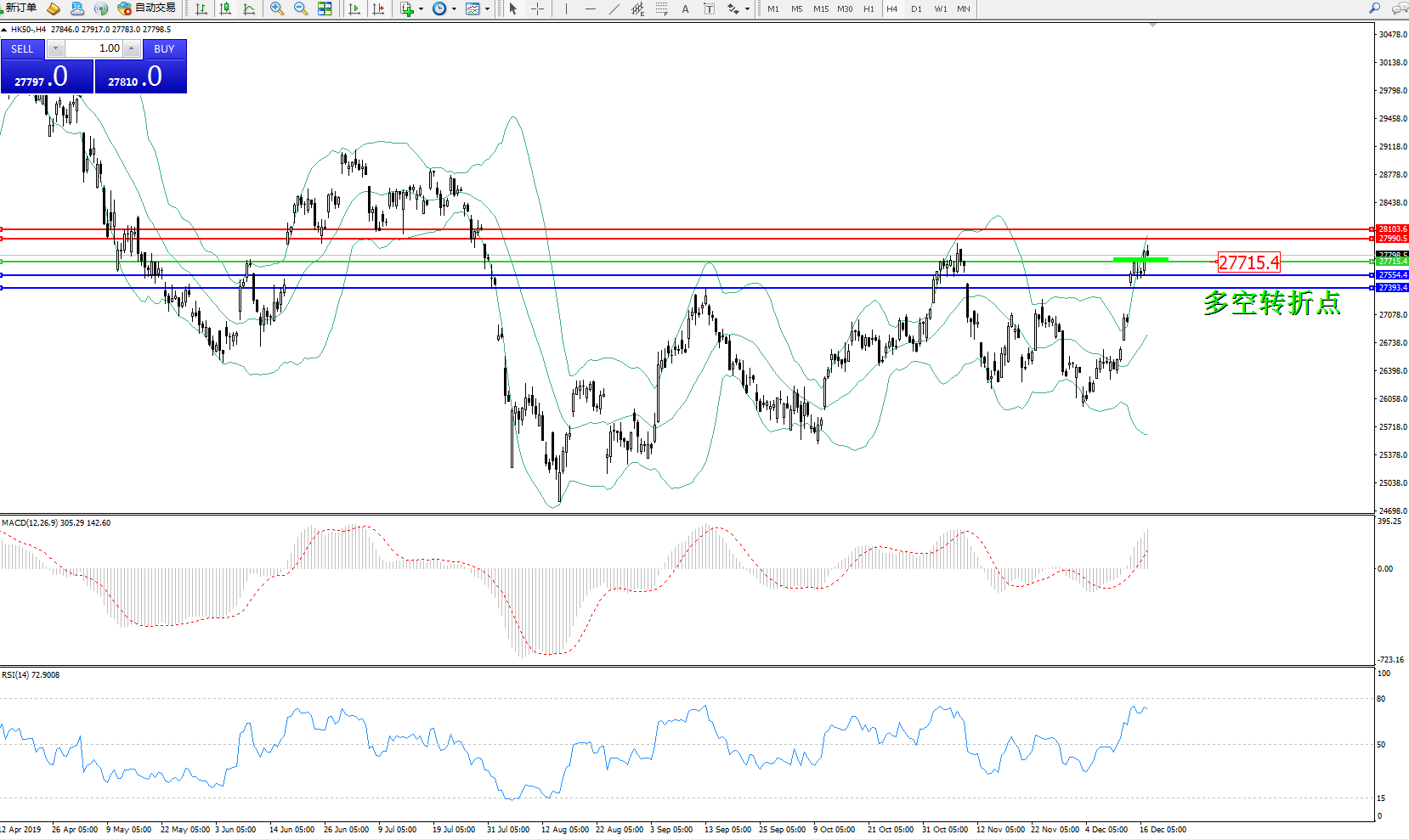 香港恒生指数12月17日(周二)收盘上涨335.62点,涨幅1.22%,报27843.71点;港股跟随外围造好而高开122点,再扩大涨幅后受压震荡,曾回落收窄升幅至仅升55点。低位见有买盘支持再抽升,恒指最高触及27785。恒指昨日一如预期出现高位调整,隔夜美股再创新高,这可能会继续带动今日市场积极投资情绪。在外围股市向好、市场信心恢复之下,港股的做多动力会持续增强,恒指向上的中线趋势不会改变。目前国际贸易前景不确定性仍存,部分投资者仍在评估协议成效。