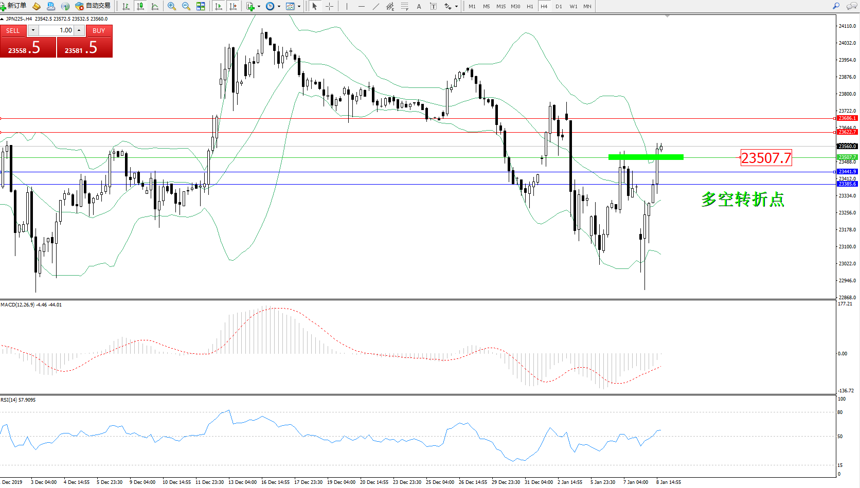 技术点评:空头动力强势宽幅震荡下行后,低位得到支撑出现反转上行态势,触及布林带指标上轨附近震荡中,有继续上行迹象,且布林带指标有张口态势,MACD指标处于空头区域低位震荡上行中,RSI指标处于空头区域震荡上行破50均衡线压制进入多头区域徘徊;
